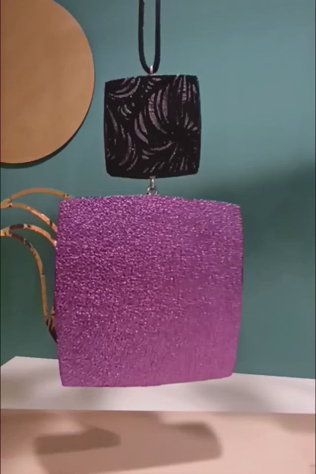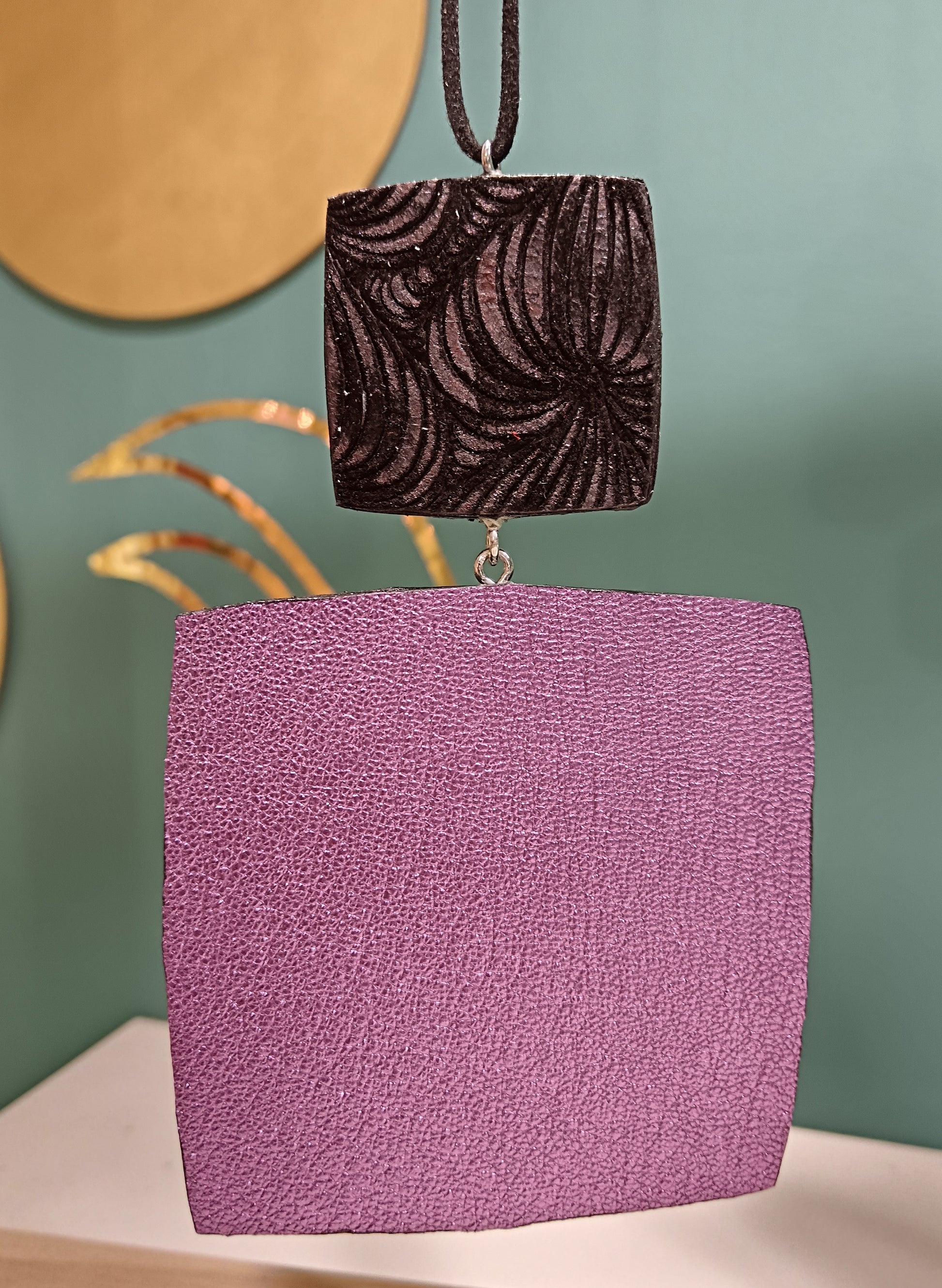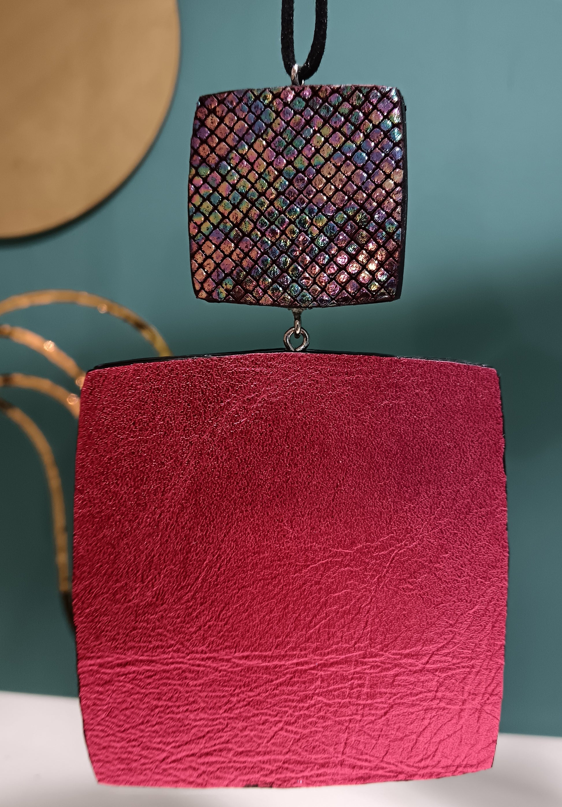Collana lunga con pendente con elementi in legno rivestiti in pelle.