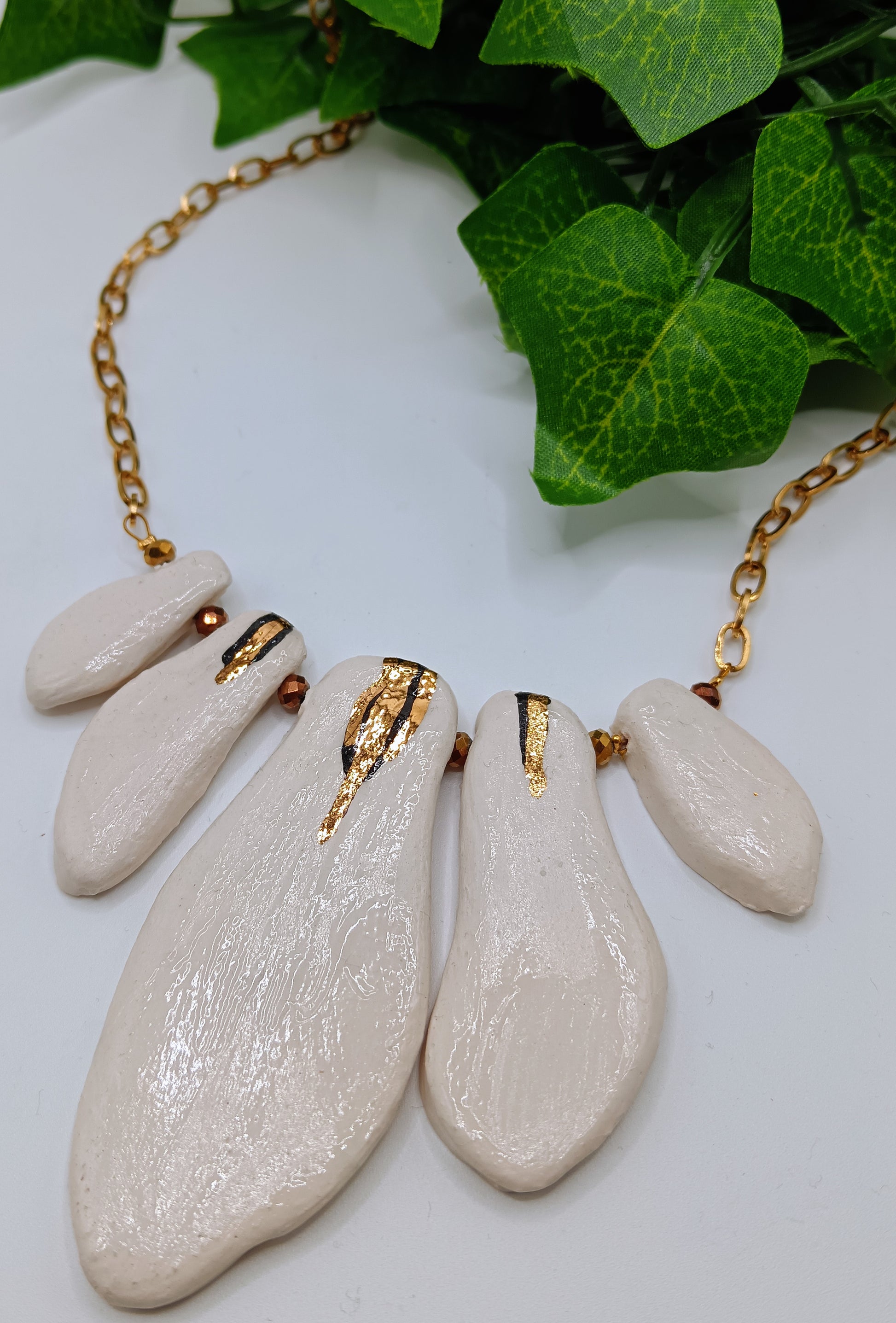 Foglie sinuose realizzate a mano plasmando l'argilla, smaltate con un bianco craclè e rifinite con pennellate di oro, rendono questa collana delicata ma di sicuro effetto.