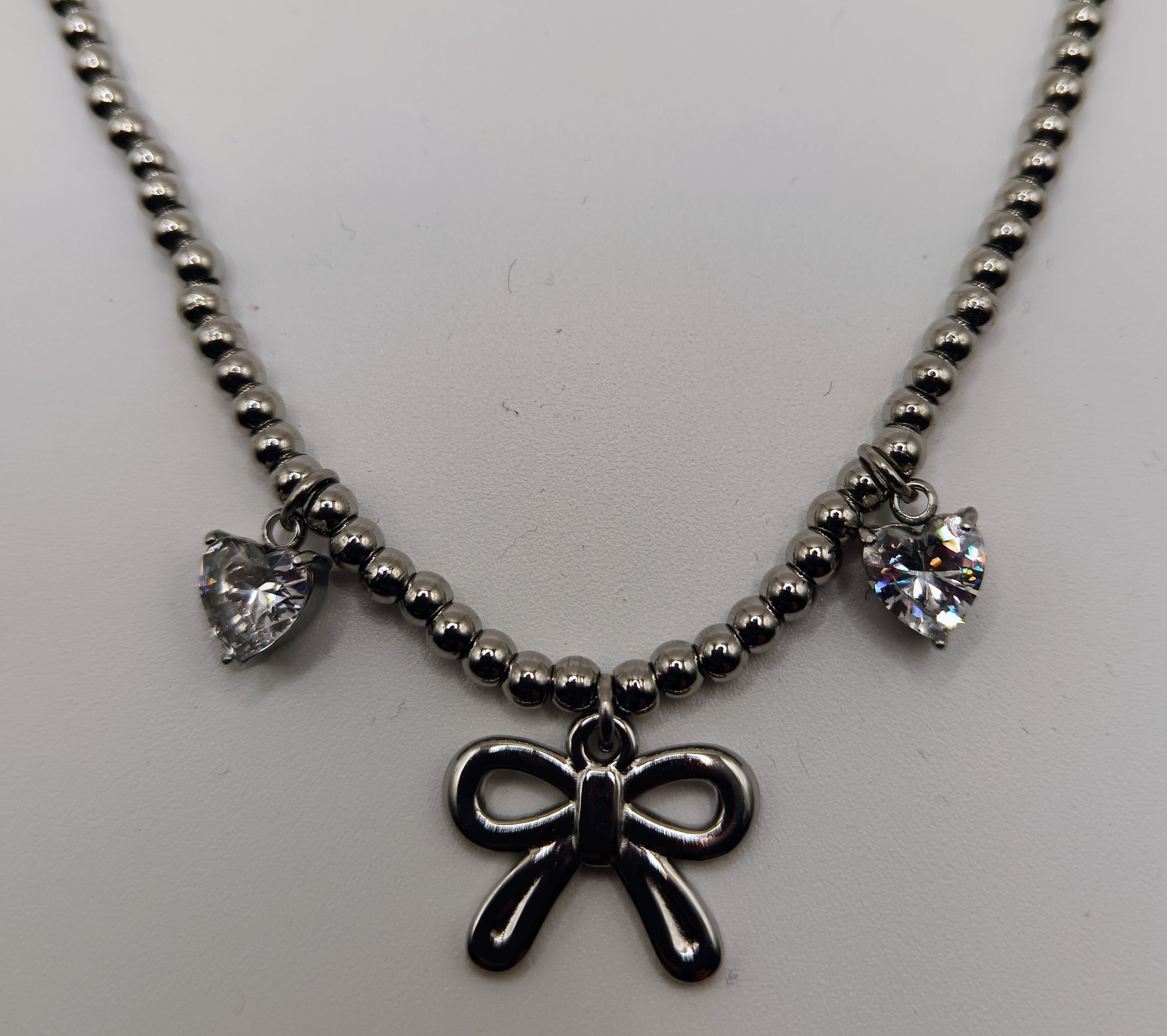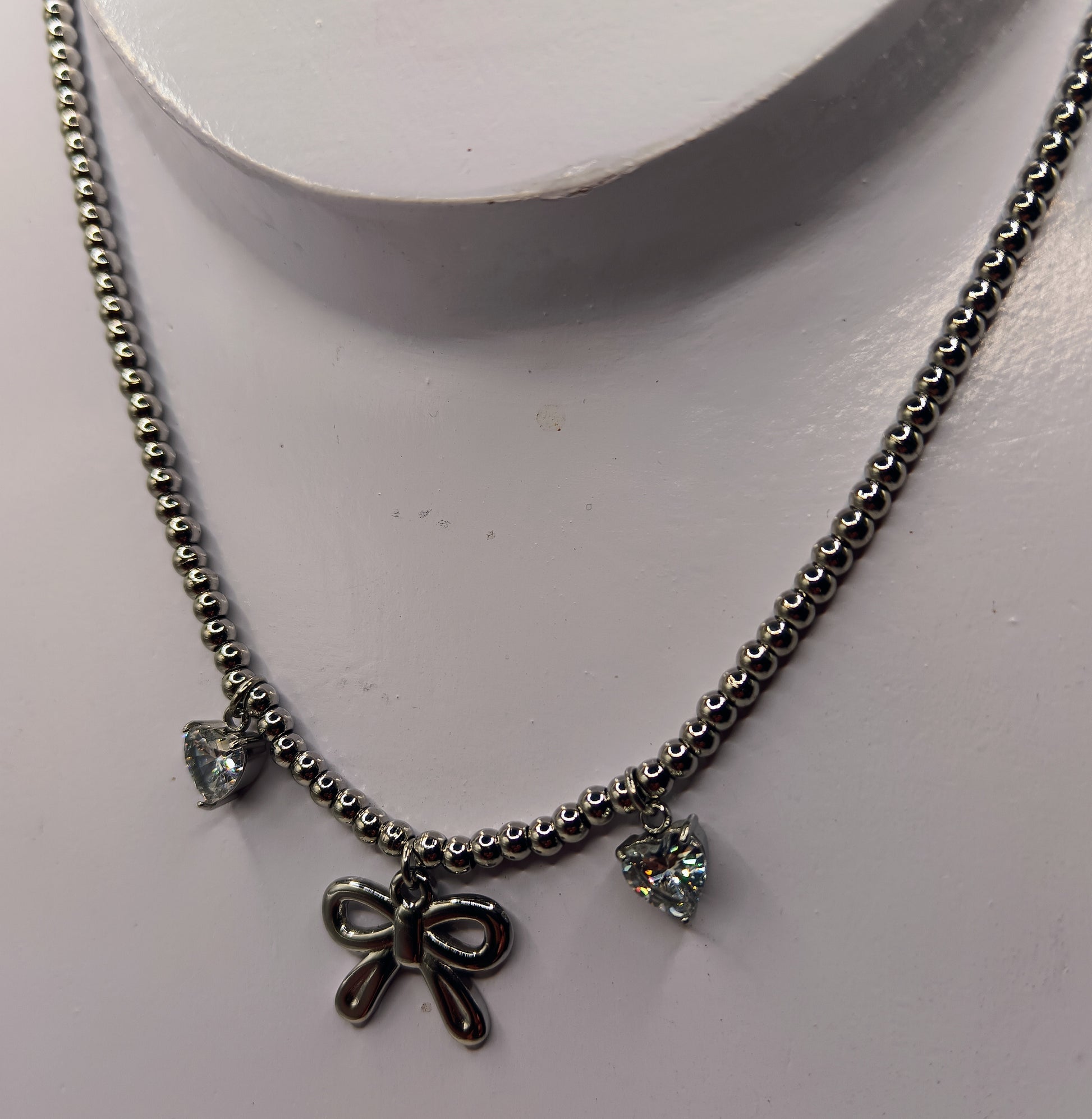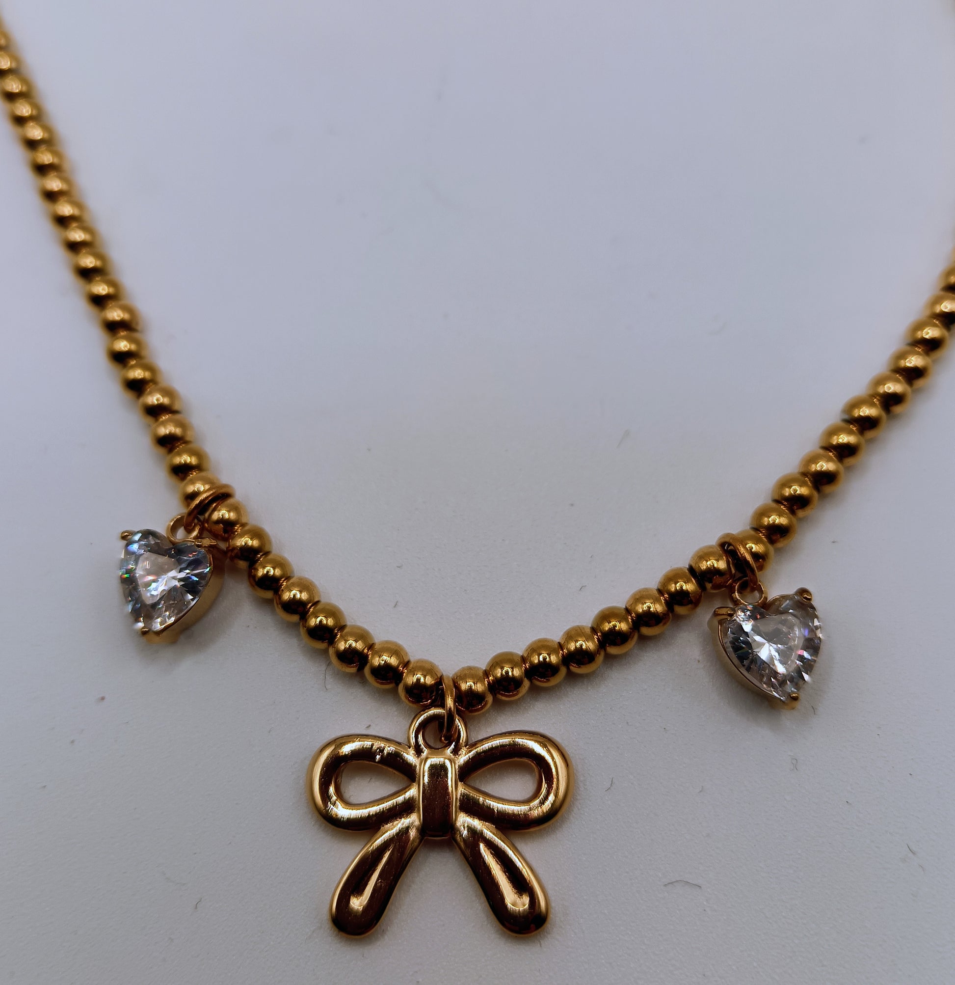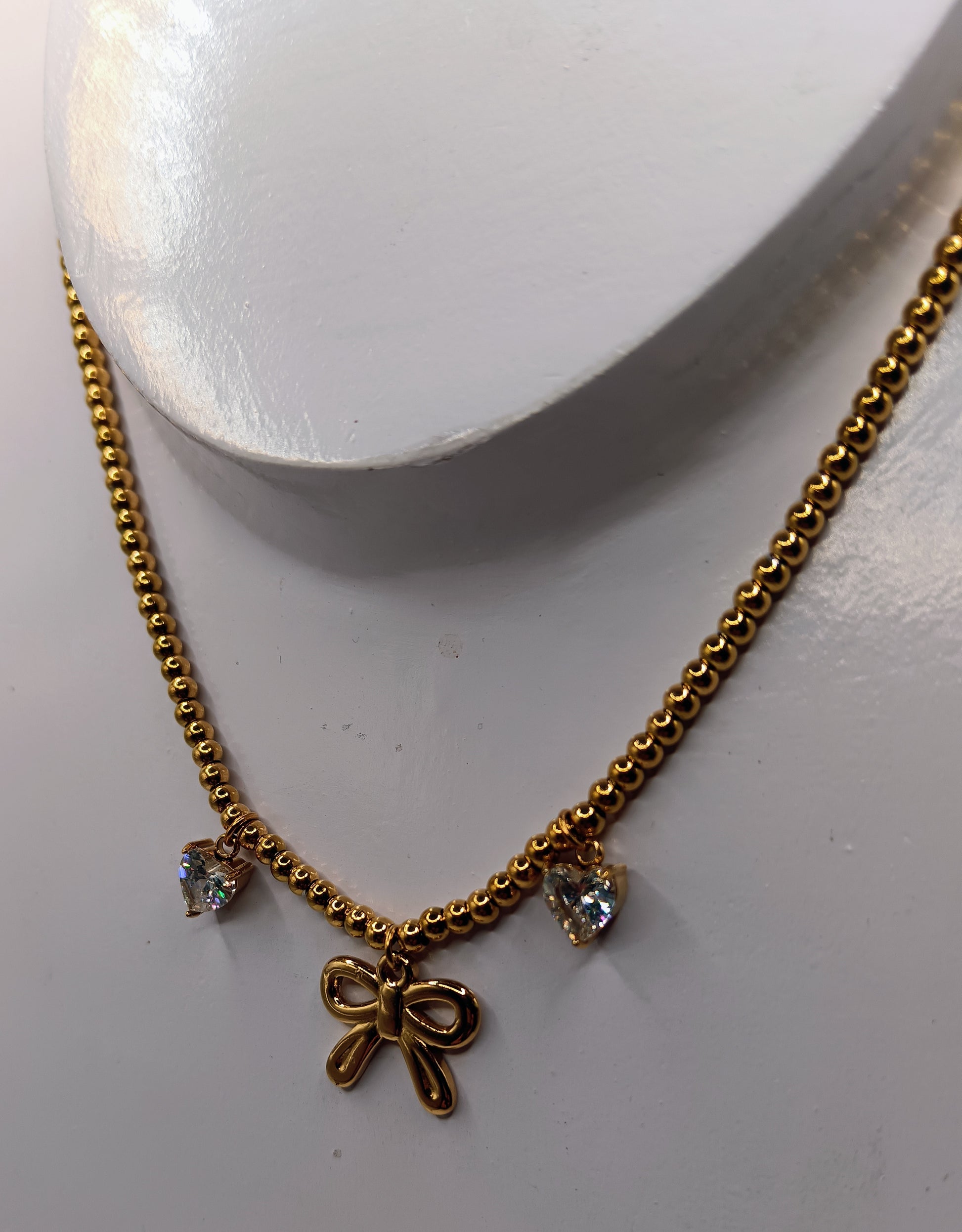 Bellissimo girogola composto da micro boule, fiocchetto centrale e due cuori laterali di zirconi incastonati.