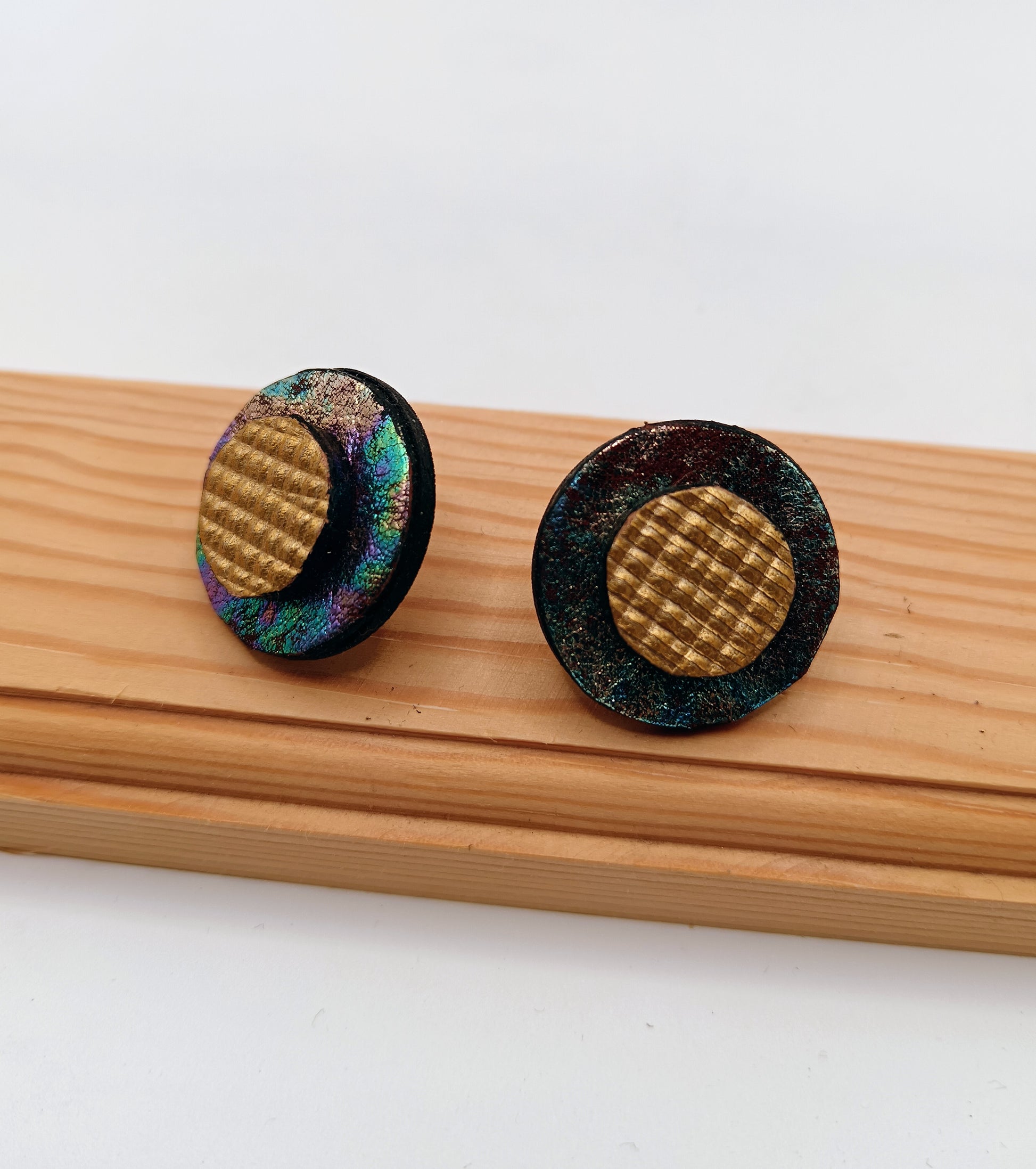 Base in legno, cerchio grande pelle olografica, cerchio piccolo pelle oro.