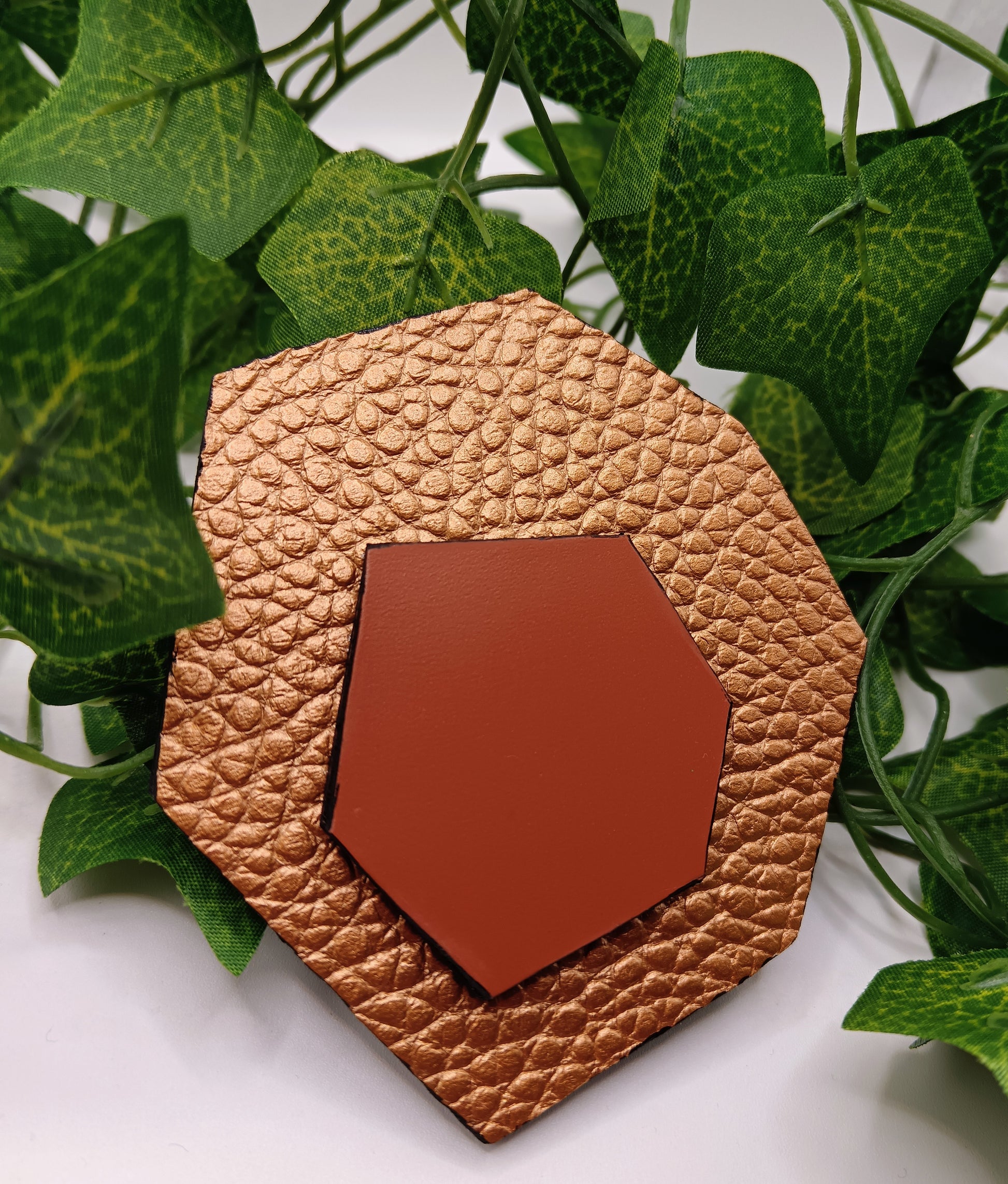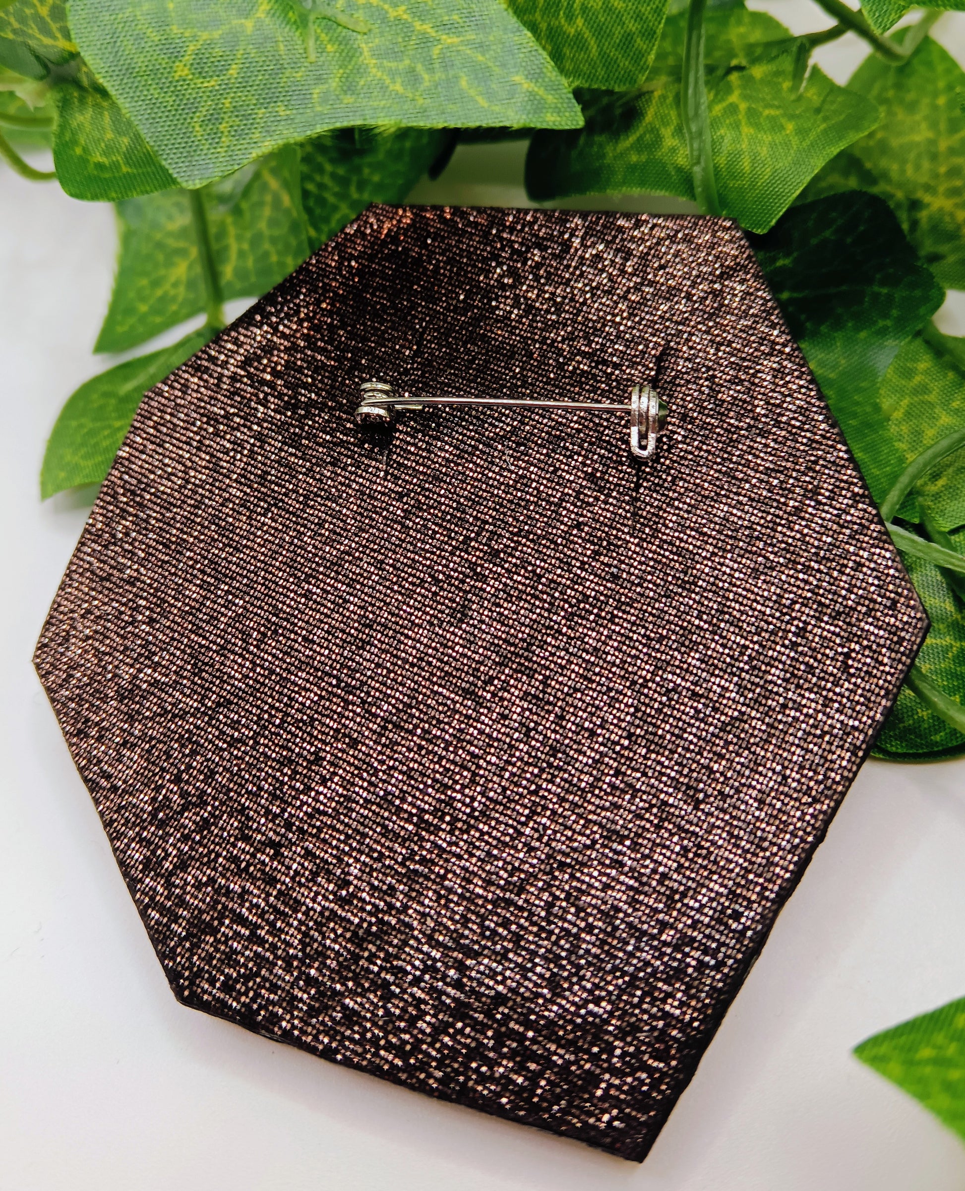 Una spilla che racconta la bellezza dell'artigianato: la solidità del legno incontra la morbidezza della pelle in un particolare geometrico che diventa dettaglio d'autore.